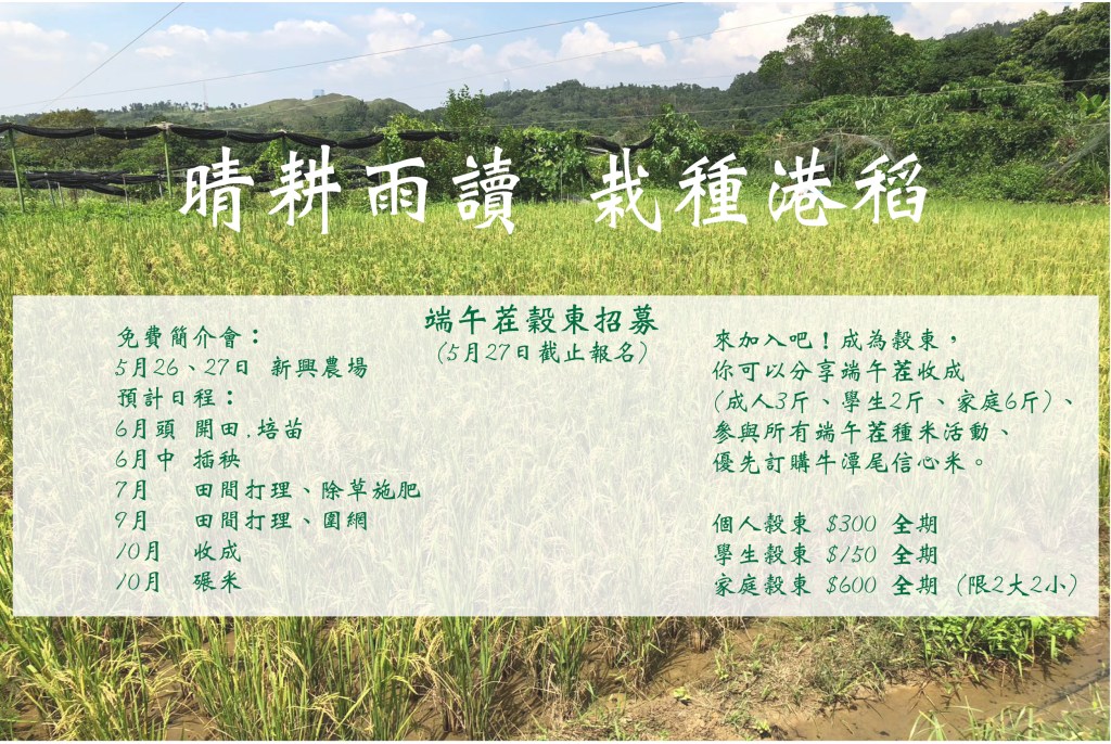 來加入吧!成為穀東,你可以分享端午茬收成(成人3斤、學生2斤、家庭6斤 * 收成有可能會受天災影響)、參與所有端午茬種米活動、優先訂購牛潭尾信心米。