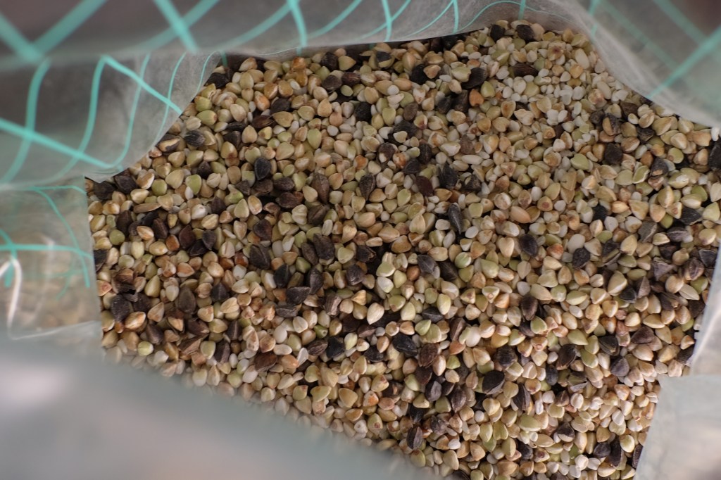 蕎麥的採收並不容易,原株收割後要脫粒,然後再曬乾,經重覆上述步驟多次,才能勉強將枝葉、未熟的蕎麥分隔。但如圖所示,雜質經過多次風選後,仍未能完全除去。