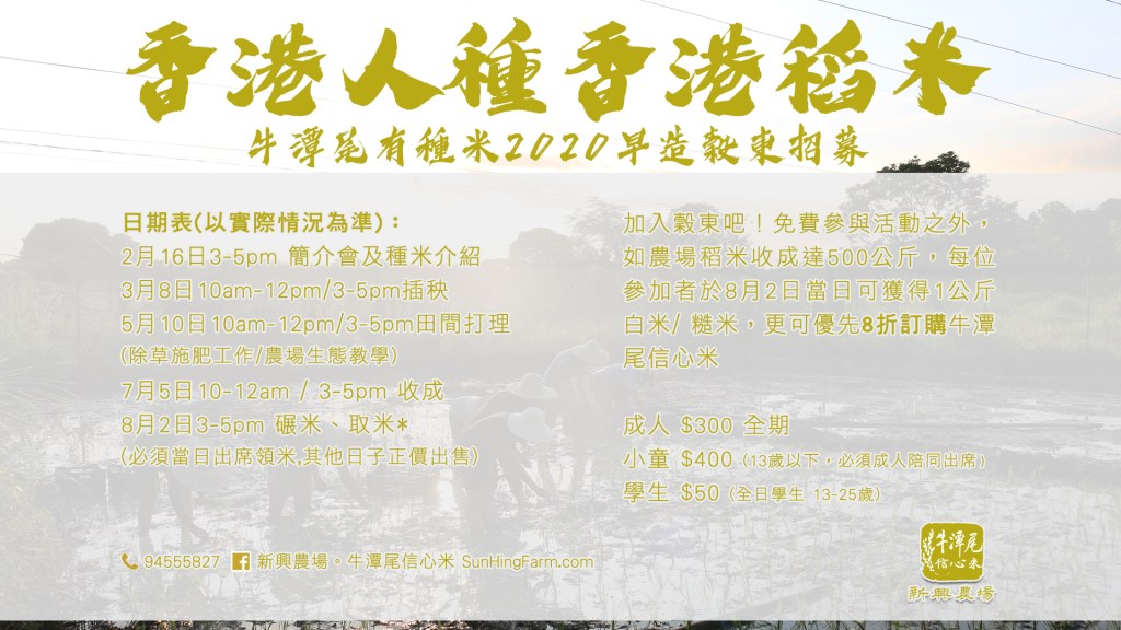 - 如農場稻米收成達500公斤,每位參加者於8月2日當日可獲得1公斤白米/ 糙米